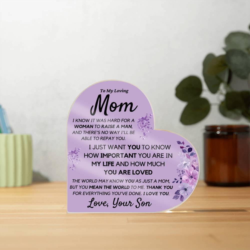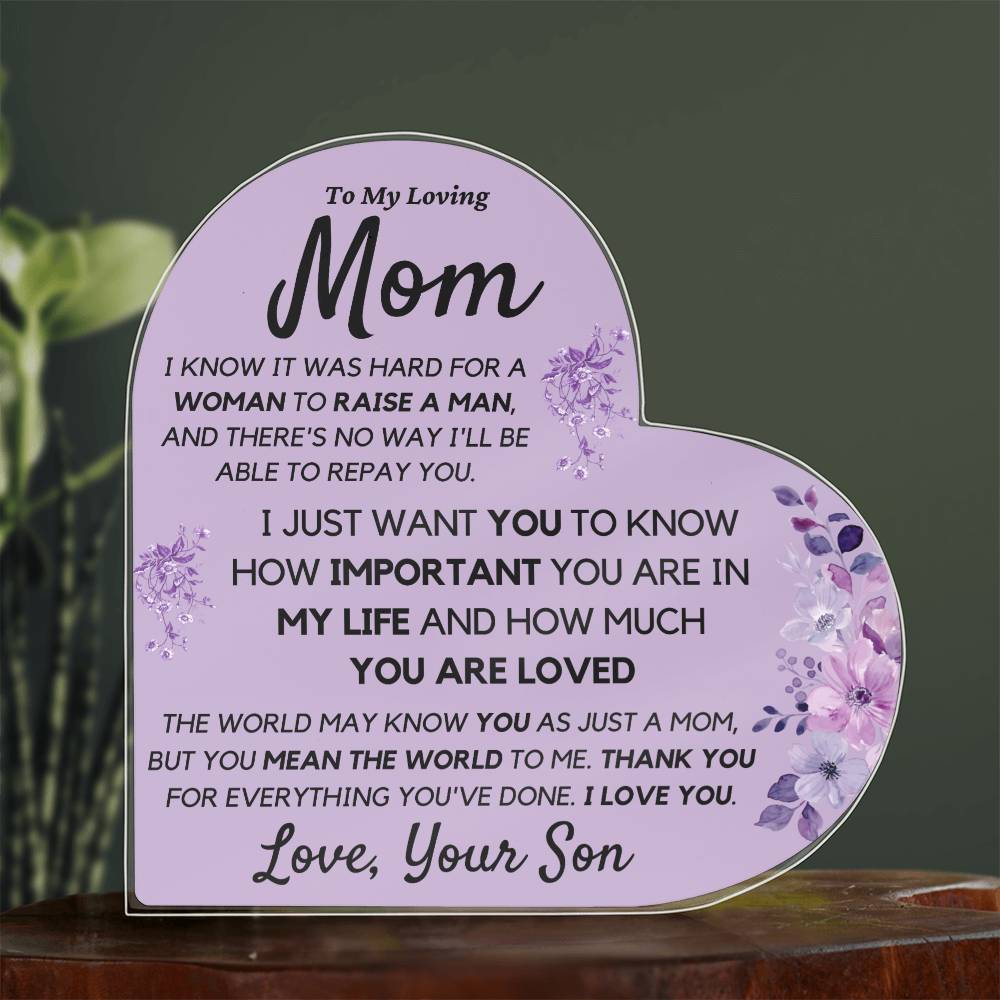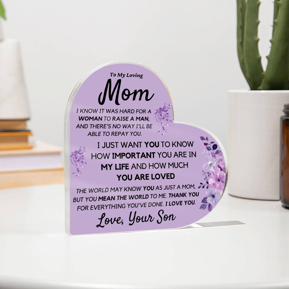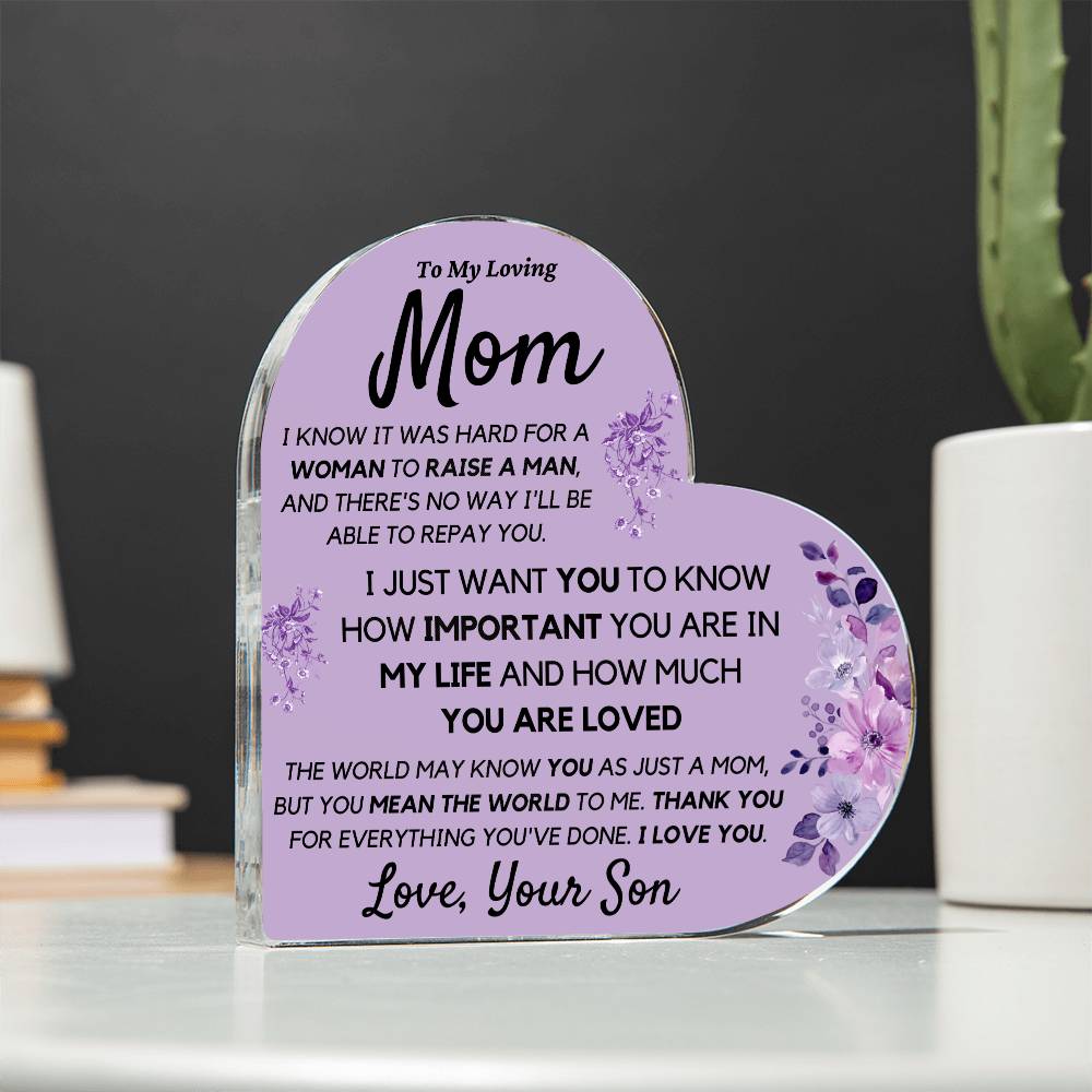 Mom from Son Acrylic Heart, Loving Thank You Note great for Mantle or Bookshelf