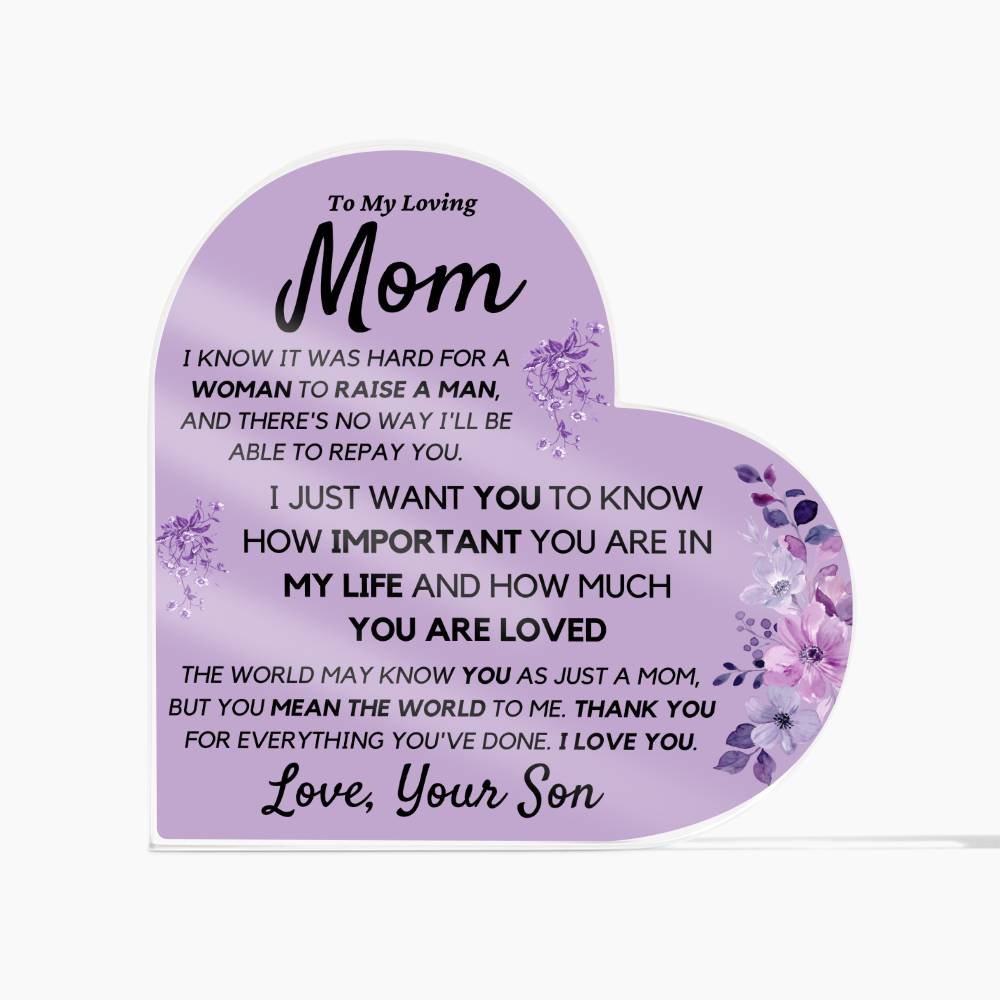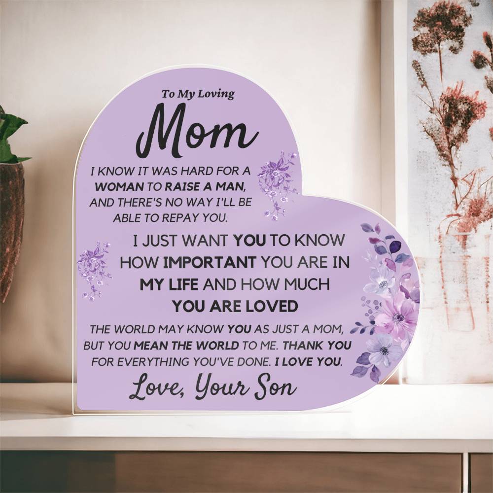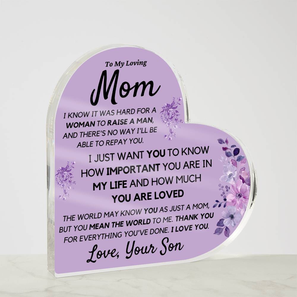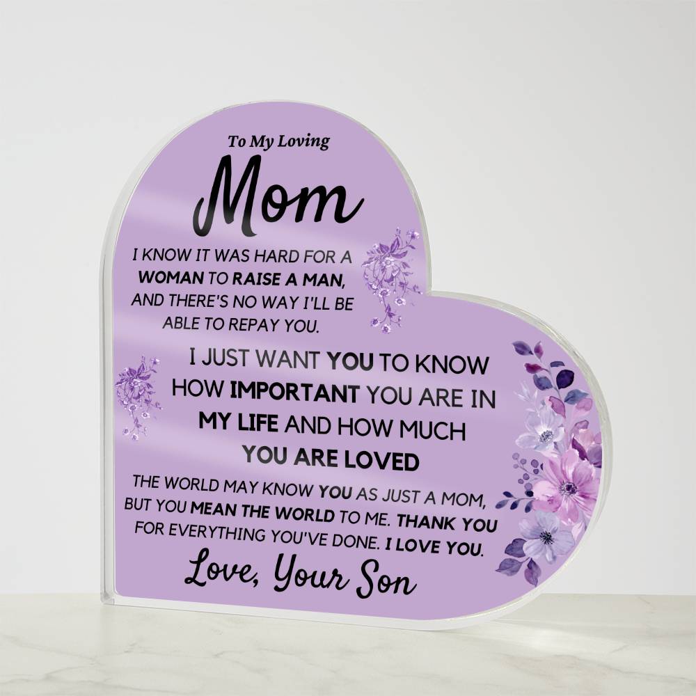 Mom from Son Acrylic Heart, Loving Thank You Note great for Mantle or Bookshelf