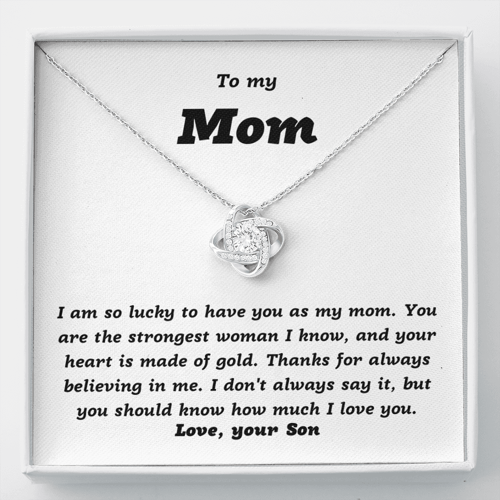 To Mom, from Son, I'm so Lucky - Love Knot Necklace, wht