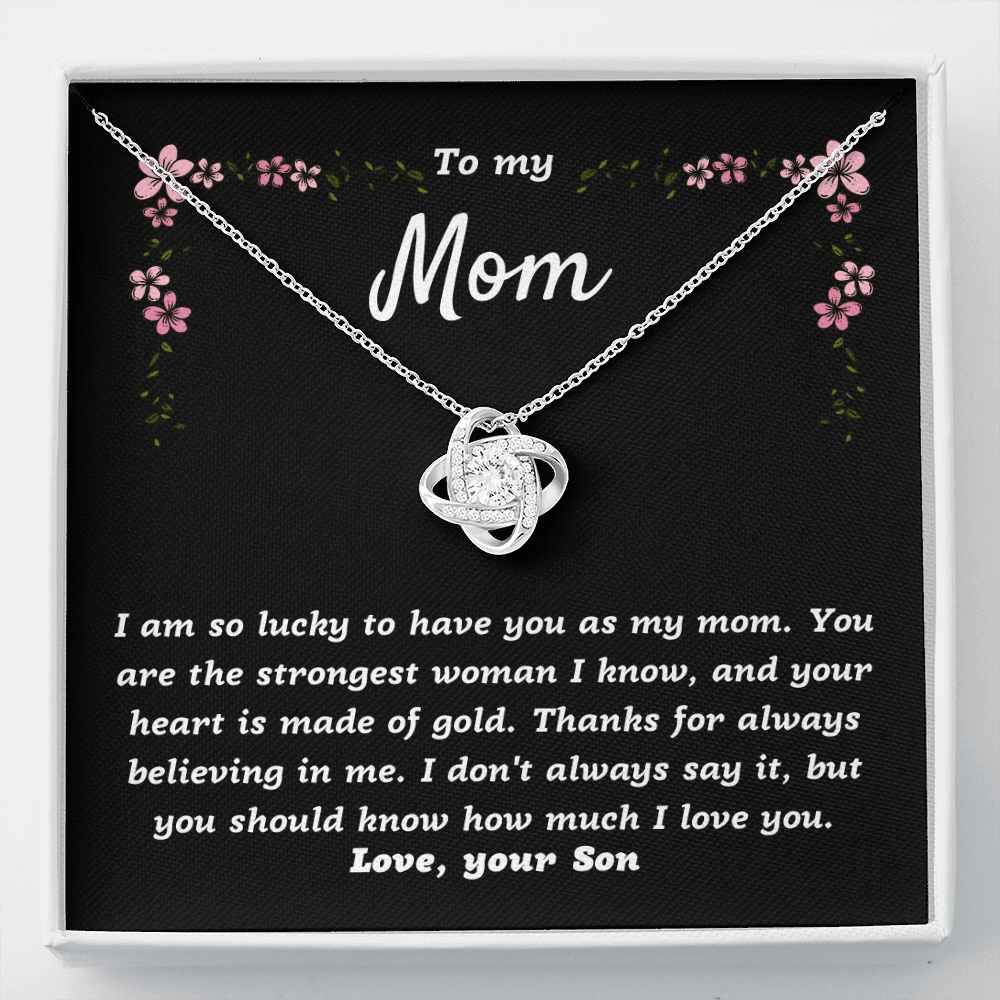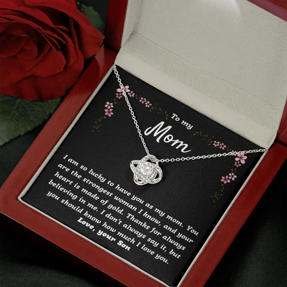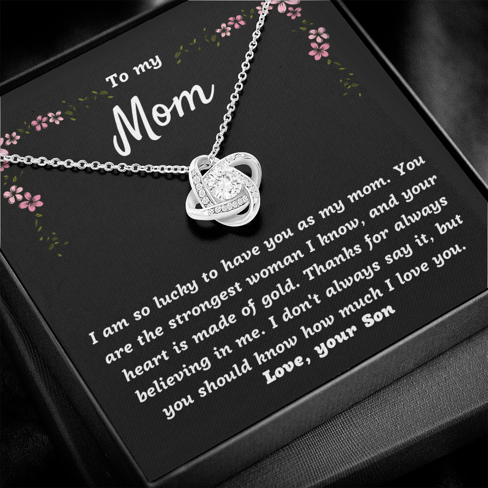 To my Mom from Son, I'm lucky to have you as my Mom - Love Knot Necklace, blk, flr